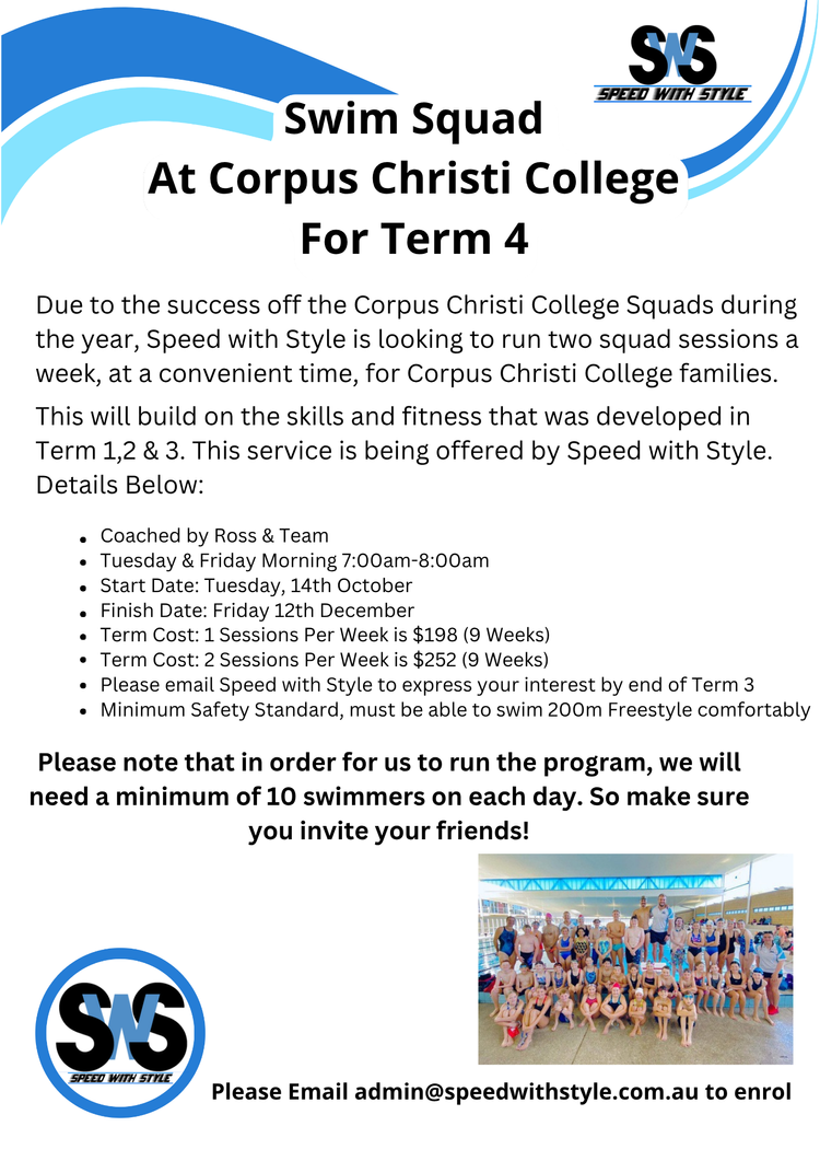 Corpus Christi College offers a Learn to Swim Program onsite at the Jennifer Reilly Aquatic Centre. The aquatic centre features a covered and heated 25 metre, eight-lane indoor lap and water polo pool, a separate 12 metre learn-to-swim pool and terrace seating for 180 people. Our Learn to Swim Program is facilitated by Speed With Style, a company who provide a unique approach to swim teaching called Individualised Custom Teaching, which was developed by Dr Nigel Williams in collaboration with head coach and Speed with Style Founder - John Williams.