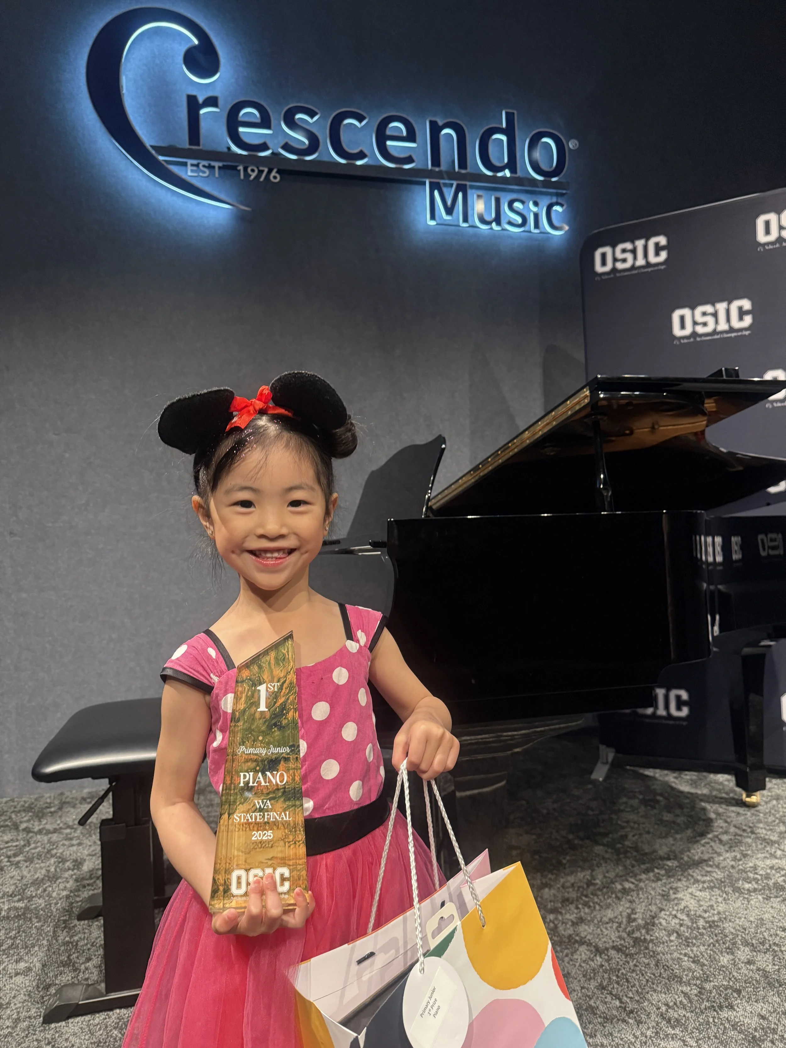 We are thrilled to share the exciting news that Gracelyn Patra (5 years old) from Kindy Green has been awarded First Prize – Division: Primary Junior (Prep to Grade 2) at the Oz Schools Instrumental Championships (OSIC) WA State Final 2025 for piano! The competition was held on Sunday, 21 September 2025, and Gracelyn’s captivating performance earned her top honours in her division.